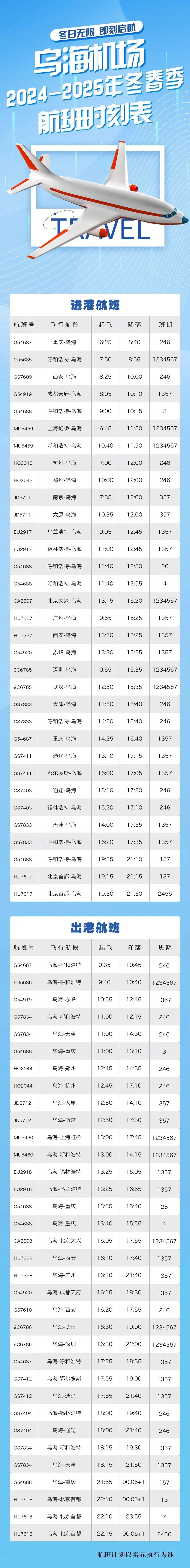 最新航班時刻表擁有強大的實時更新功能,確保您隨時掌握最新的航班動態(tài),無論是航班延誤、取消還是新增航班,都能實時更新到您的手機或設(shè)備上,系統(tǒng)還具備自動提醒功能,讓您在出發(fā)前了解航班信息,輕松安排行程,不再為錯過航班而擔(dān)憂。